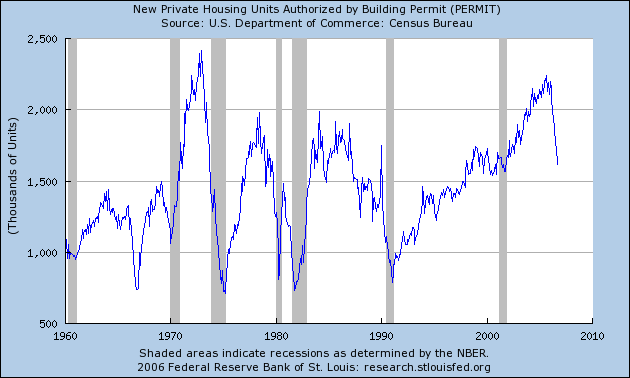 Something for everyone in this week’-s data on housing from the Census Bureau. Pessimists will note the alarming 6% plunge during the month of September in seasonally adjusted new building permits. That one-month drop from the already low levels of August leaves them down 28% from September 2005. News this week of rising delinquencies and foreclosures provides more fuel for the pessimists’- fire.