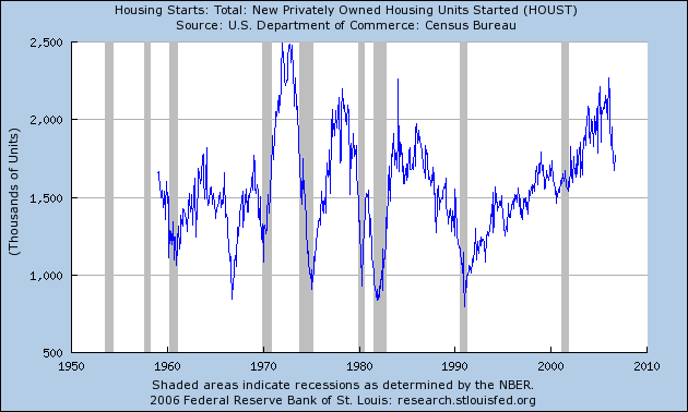 I’-m wondering though whether “-no change”- might be the least likely outcome at this point. If we start to see some serious financial repercussions develop in housing, I’-d look for a rate cut, and wouldn’-t worry in that event about commodity prices, since I would expect to see commodities fall sharply on news of a big downturn in economic activity. On the other hand, if instead we have seen the bottom for housing and the core inflation numbers remain this high, I’-d look for the Fed to tighten further.