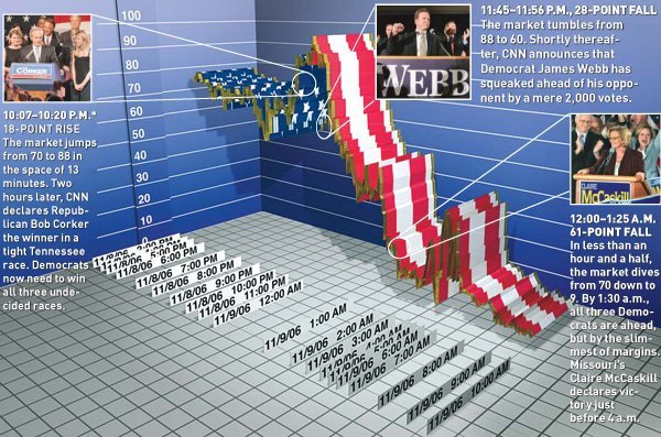 The betting site [*] intrade.com offered a security that would pay out $100 if the Republicans held their majority in the U.S. Senate and nothing if they lost. For weeks, it had been trading at around 70, reflecting the consensus view that there was a 70 percent chance that the Republicans would hold power. But as the results came in, the market—not the media—was first to smell the upset.