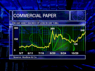 Kudlow notes that the spread between 30-day asset-backed commercial paper and U.S. Treasuries, which spiked up dramatically after August’-s liquidity events but subsequently eased back down, climbed back up during November to the neighborhood of its previous high.